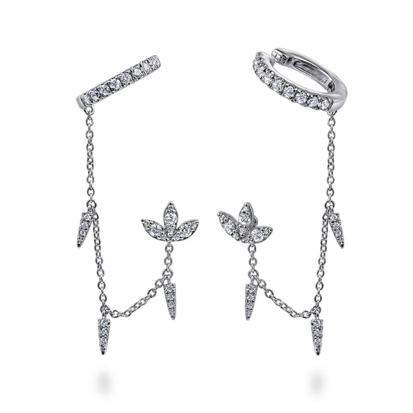14k White Gold Diamond Lotus Single Stud With Chain Drop And Diamond Ear Cuff