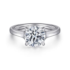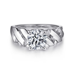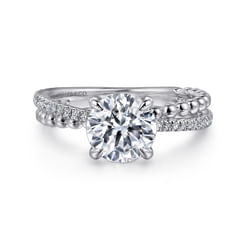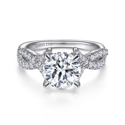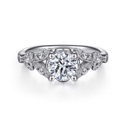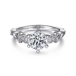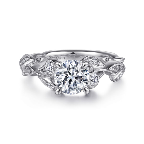 Precious petals with diamonds inside and milgrain detailing around them are stationed throughout the band of this 0.16ct engagement ring. Designed to look like twisted vines, the 14K white gold shank captures the beauty in nature around us. Accent your 1ct round center stone with this beautiful floral ring.Item CodeER15626R4W44JJDivisionGabriel BridalCollectionFloral NouveauProduct NameLenaStyleFree FormMetal Type14k White GoldCenter Stone ShapeRoundCenter Stone Carat Weight1 ctCenter Stone Size6.5 mmTotal Diamond Weight0.16 ctAverage Diamond ClaritySI or higherAverage Diamond ColorG-H ColorGemstoneNatural Diamond -