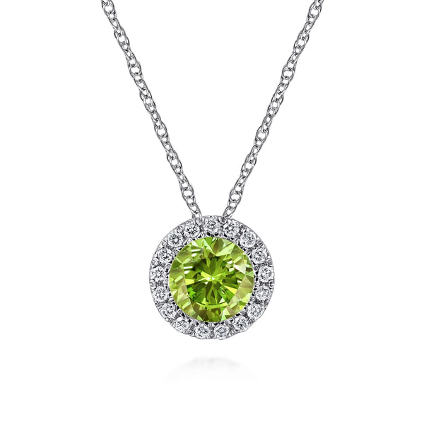 14K White Gold Peridot and Diamond Halo Pendant Necklace