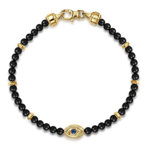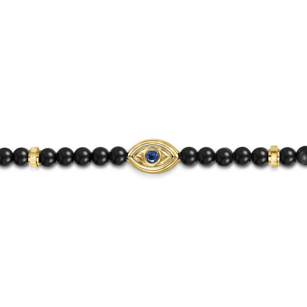 14K Yellow Gold 4mm Onyx and Sapphire Beaded Bracelet with Evil eye