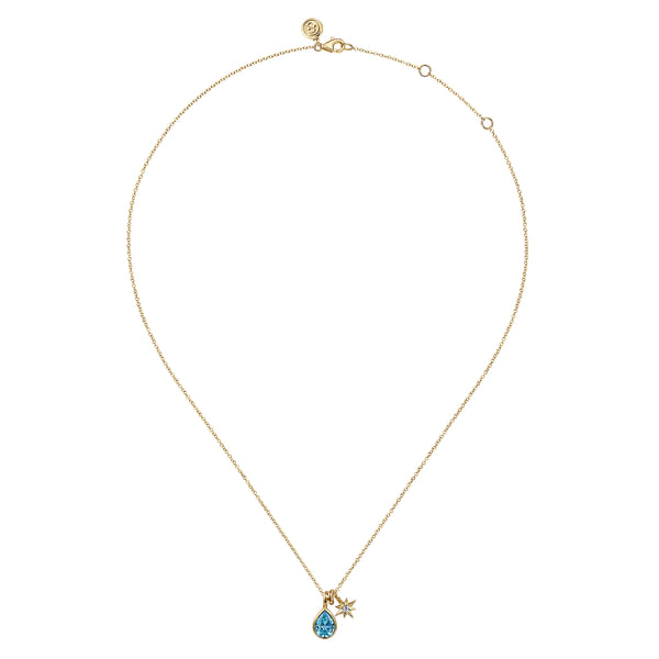 14K Yellow Gold Blue Topaz and Diamond Teardrop Pendant Necklace
