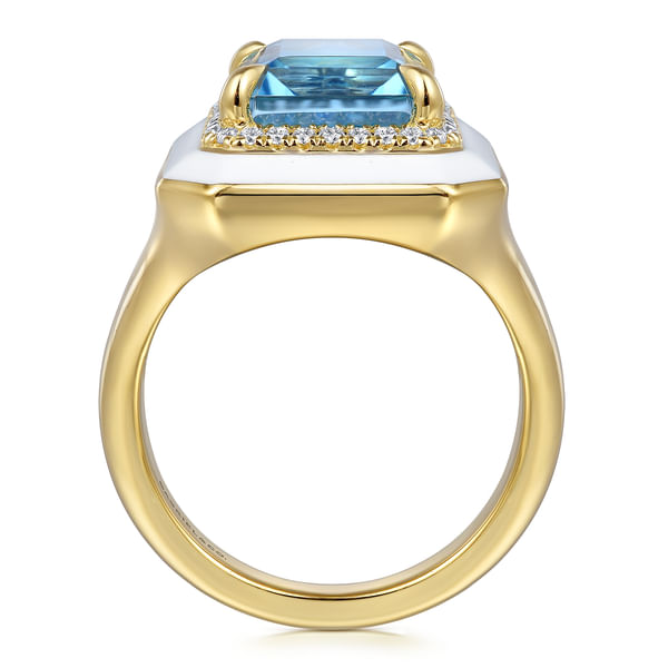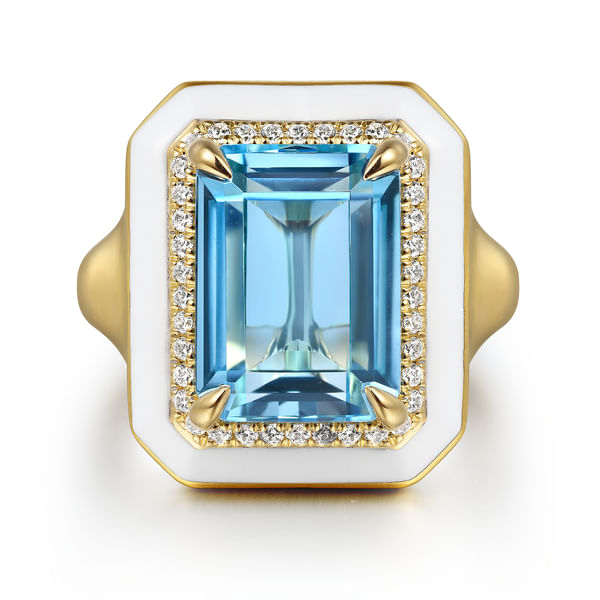 Enamel - 14K Yellow Gold Diamond Halo and Blue Topaz Cocktail Ring with White Enamel