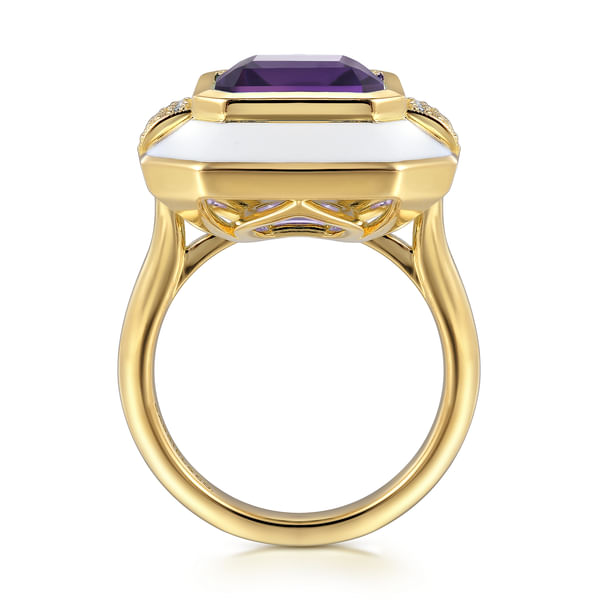 Enamel - 14K Yellow Gold Diamond and Amethyst Cocktail Ring with White Enamel