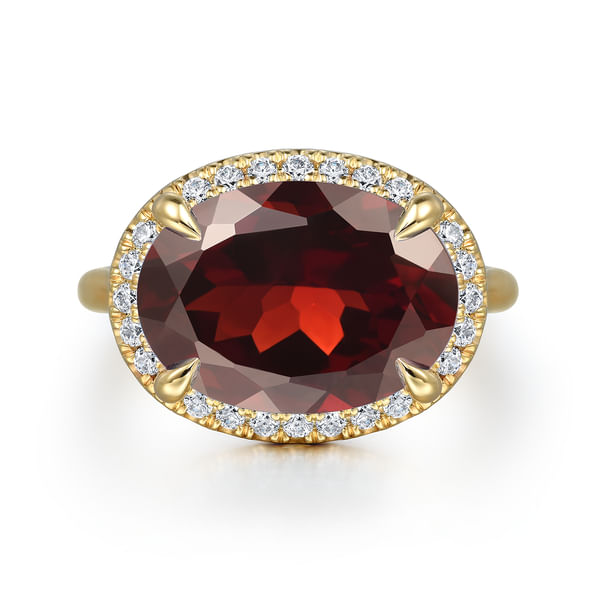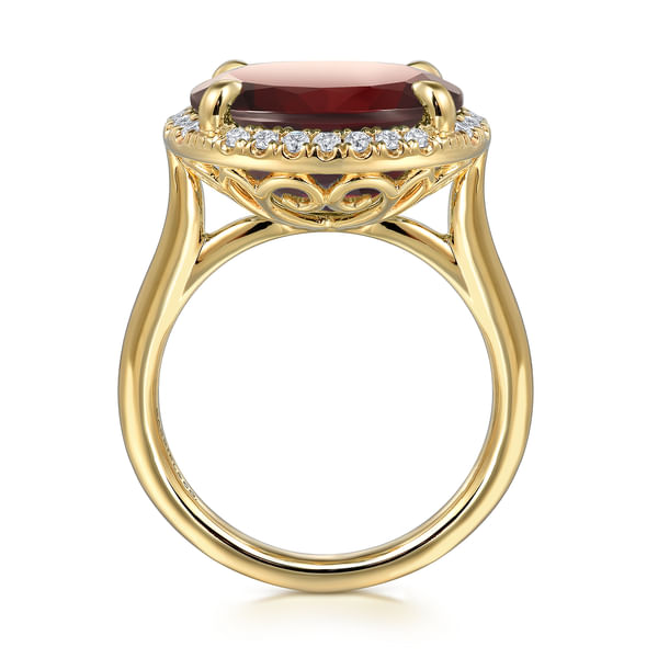 14K Yellow Gold Diamond and Oval Shape Garnet Ladies Ring With Flower Pattern Gallery