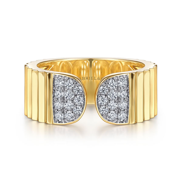 Diamond Cut - 14K Yellow Gold Open Ring with Diamond Pave End Caps and Diamond Cut Texture