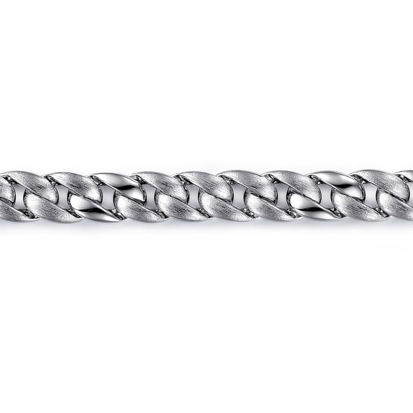 This sterling silver Cuban link bracelet features thick, interlocking links with a brushed surface for a modern matte appeal. A rectangular clasp etched with the Gabriel & Co. signature adds a distinctive finishing touch.