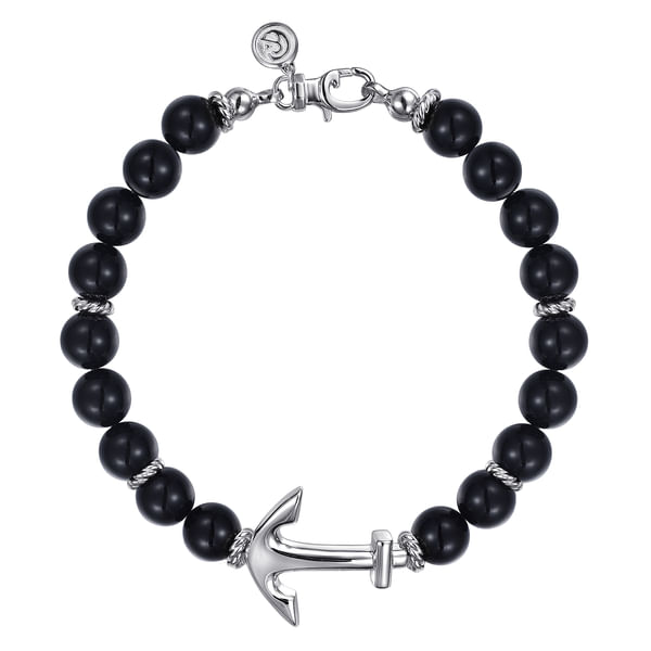 Sterling Silver and 8mm Onyx Beaded Bracelet with Anchor