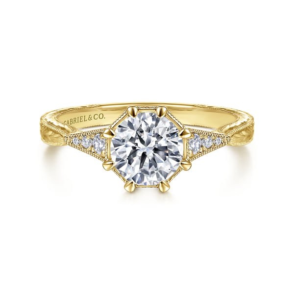 Item CodeER14770R4Y44JJDivisionGabriel BridalCollectionArt DecoProduct NameSannaStyleStraightMetal Type14k Yellow GoldCenter Stone ShapeRoundCenter Stone Carat Weight1 ctCenter Stone Size6.5 mmTotal Diamond Weight0.09 ctAverage Diamond ClaritySI or higherAverage Diamond ColorG-H ColorGemstoneNatural Diamond -
